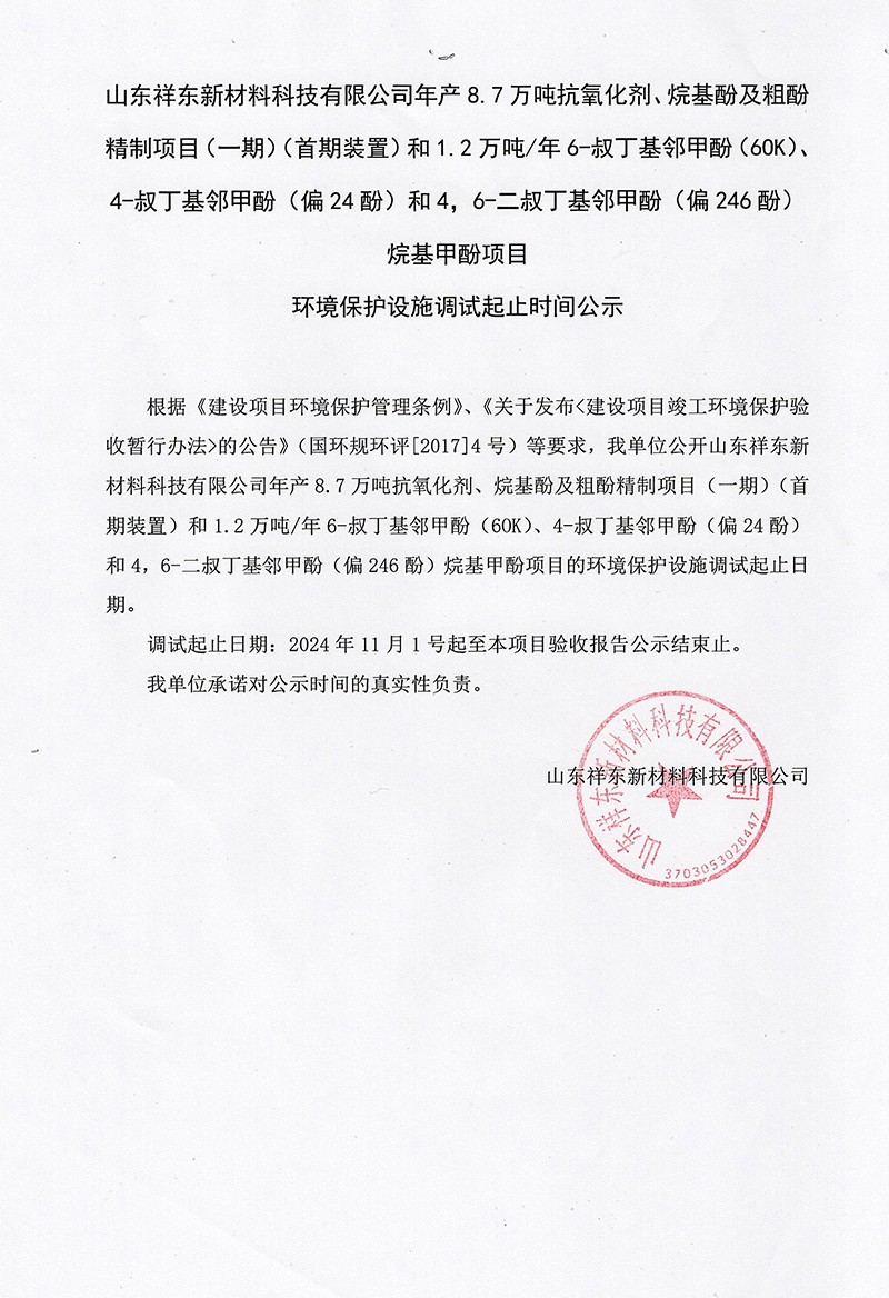 烷基甲酚項目環(huán)境保護設施調試起止時間公示